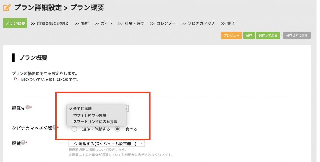 主催者管理画面の「掲載プラン一覧」「掲載イベント一覧」「商品一覧」から、対象にしたいコンテンツの編集画面に入り、「掲載先」から「全てに掲載」、もしくは「スマートリンクのみに掲載」を選択してください。