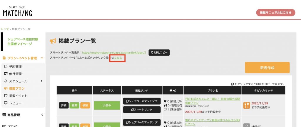 主催者管理画面の「掲載プラン一覧」の上部にある「スマートリンクページのホームボタンのリンク設定はこちら」をクリックしてください。