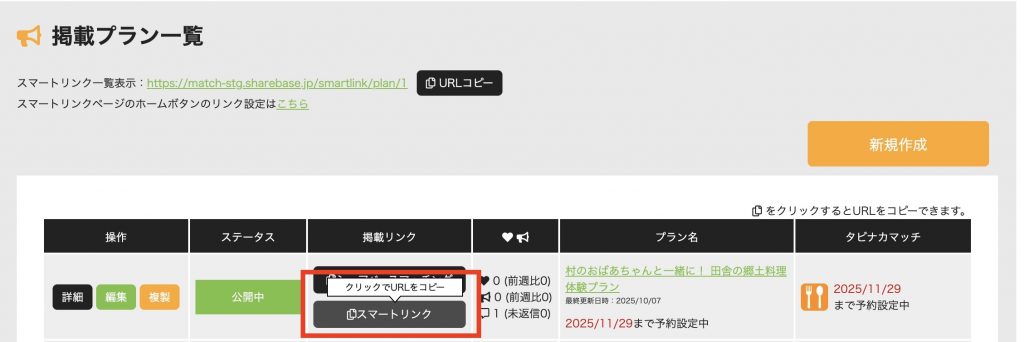 主催者管理画面の「掲載プラン一覧」「掲載イベント一覧」「商品一覧」のページにそれぞれ、「スマートリンク一覧表示」のURLが表示されるので、コピーして任意の位置に貼り付けてご利用ください。プラン・イベント、商品単体でのスマートリンクは、対象コンテンツに「スマートリンク」ボタンがありますので、そちらからURLを取得してご利用ください。