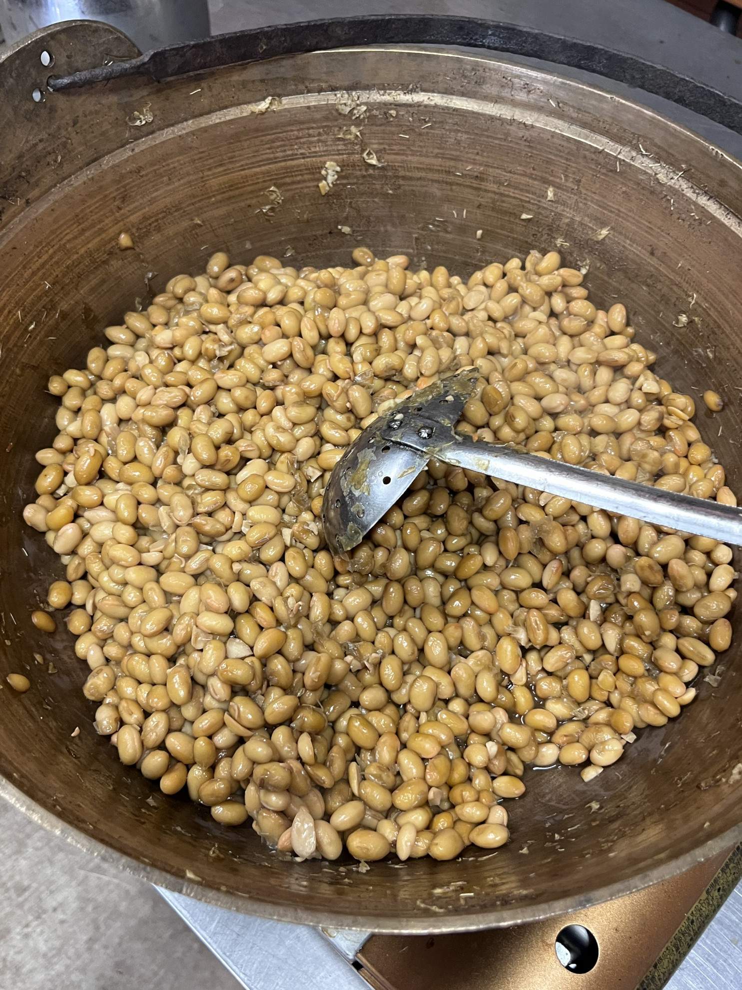 藁苞作りと同時進行で納豆豆を茹でます。